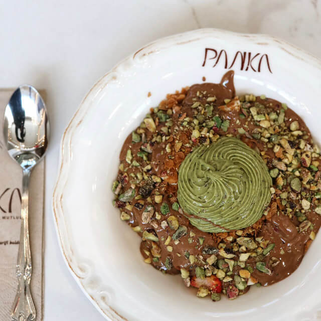 Çilek, muz, fransız bisküvisi, Antep Fıstığı kreması, Antep fıstığı callebaut çikolata.